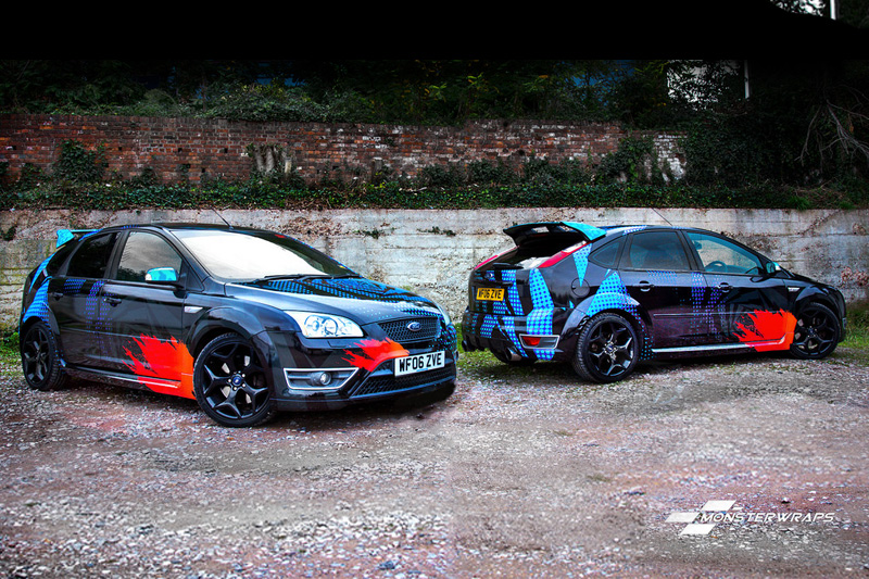 Ford Focus ST wrapped in digitally printed Ken Block Gymkhana replica graphics designed by sllkevin and installed by Monsterwraps Ltd.